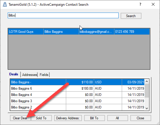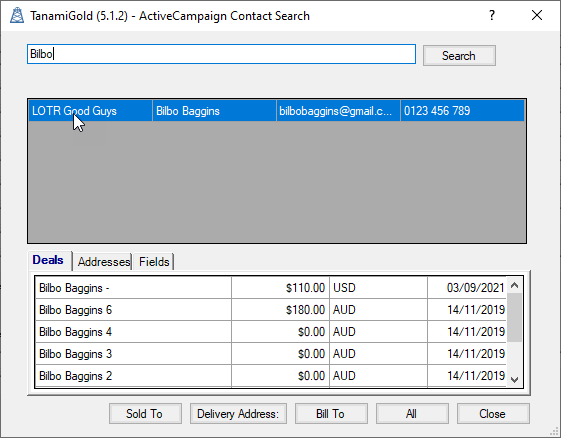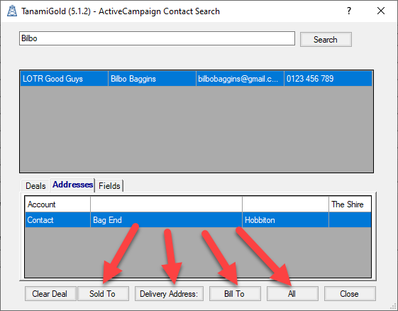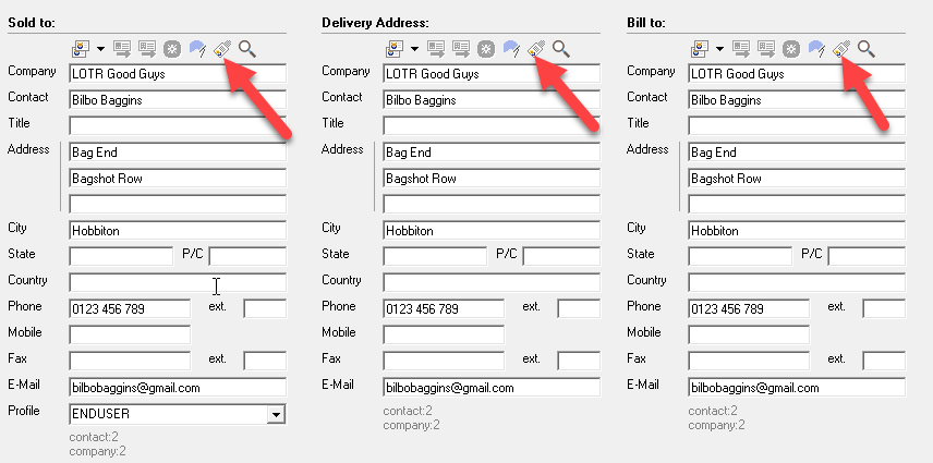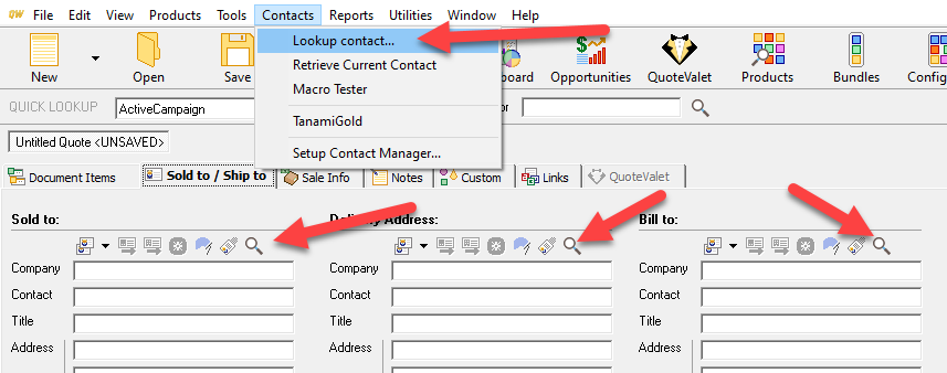 To add the contact details to the quote, select one of the address buttons. In this example, because we have customised the Ship To and change it to Delivery Address, that is the label used on the button. If you use the All button, the contact is added to all three address types.