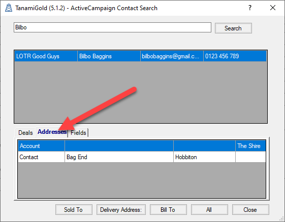Select the Addresses tab to show all the available addresses as defined in the Address Groups setup, and they can be on the Account, Contact or Deal. When you change the section, the addresses are searched again based on the selection.