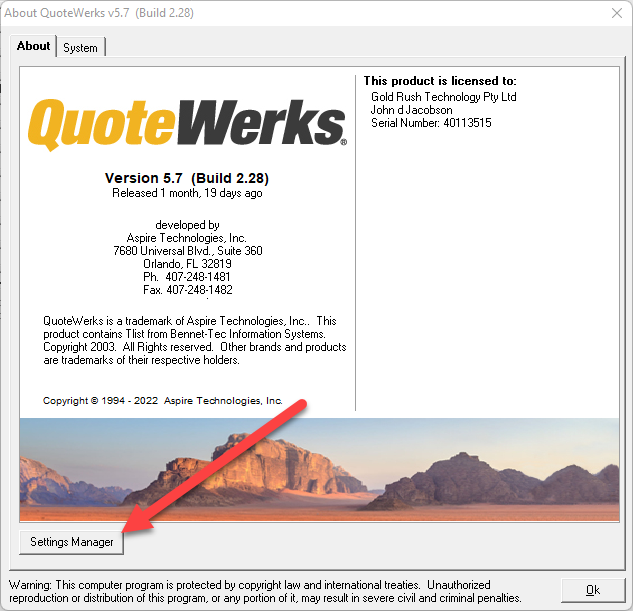 In QuoteWerks, as a master rights user, go to the Settings Manager in Help, About.