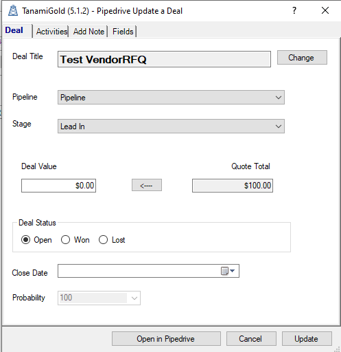 When you save your document in QuoteWerks, if it's linked to a Pipedrive contact, it will show the following screen if it's linked to a deal, unless you have limited this via the document status in the user settings.