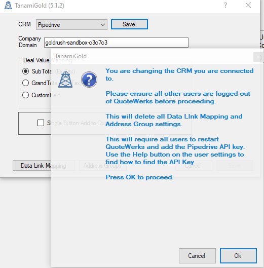 You will need to restart QuoteWerks after you have changed this setting. Then you will have to proceed to add in your new Data Link Mappings & Address Groups.