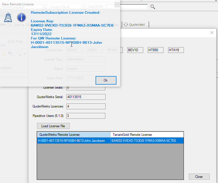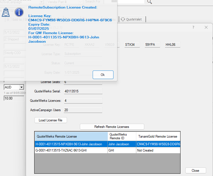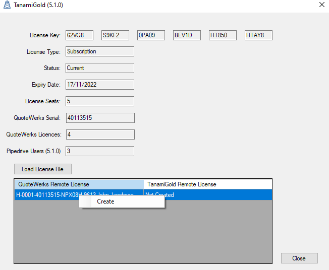 To create the remote TanamiGold license, right click on the remote QuoteWerks license and click on Create