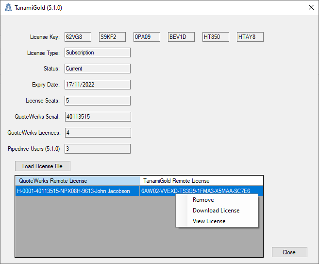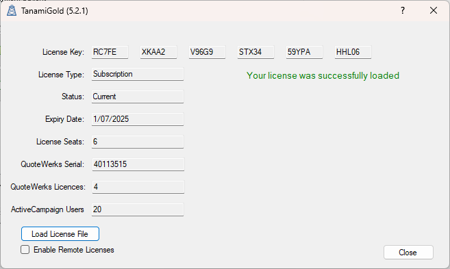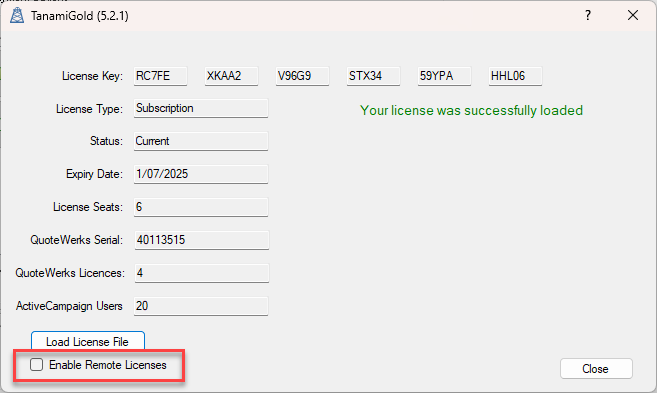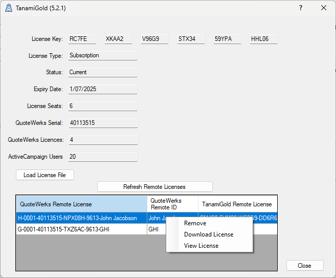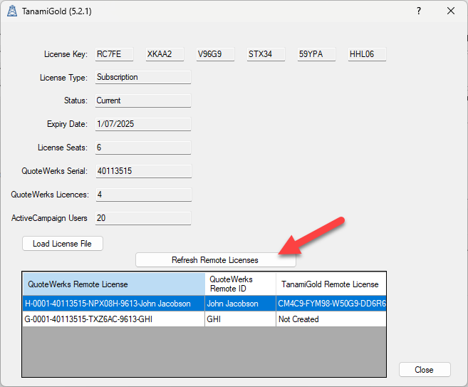 If you add or remove remote licenses within QuoteWerks, you need to press the Refresh Remote Licenses button to refresh the licenses from QuoteWerks.