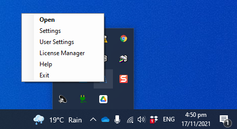 Or double click left button to open the main window. This is the same as selecting Open from the menu shown above.